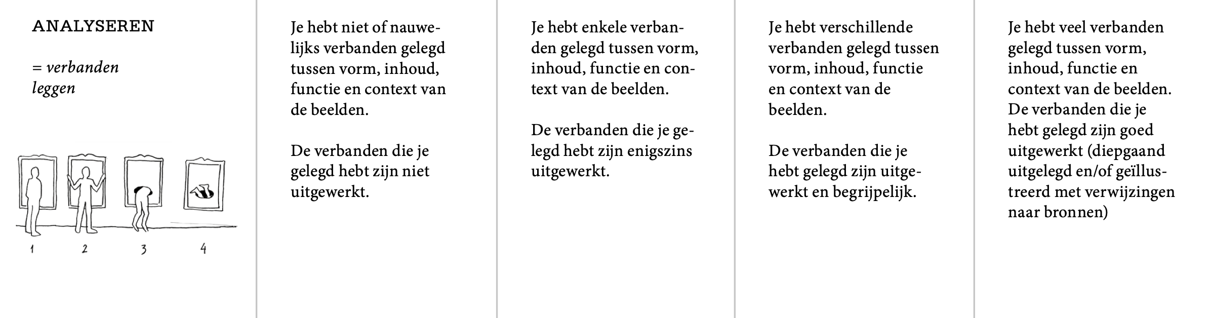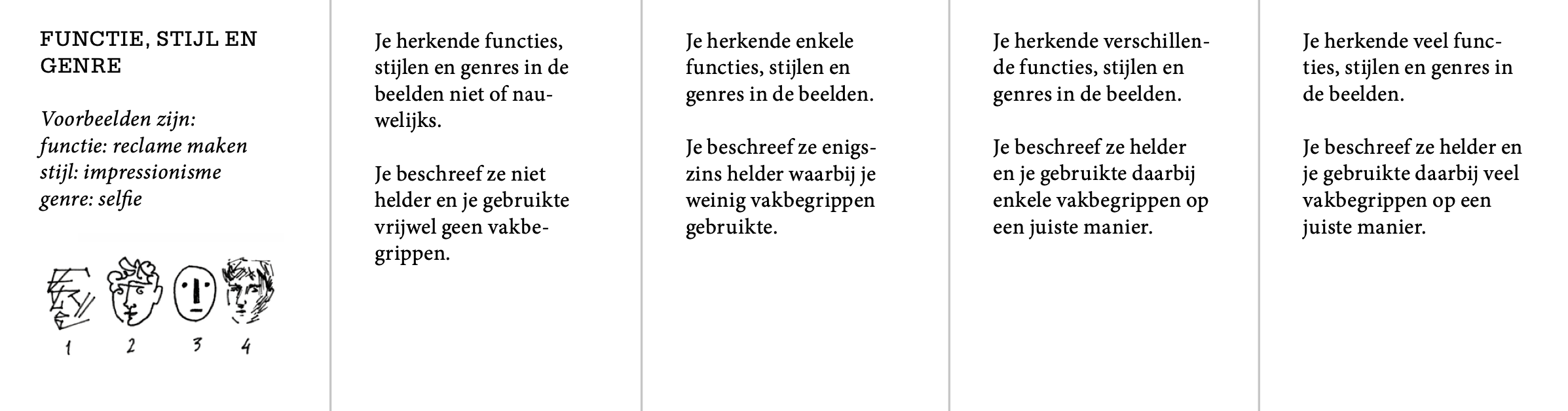 Uit de competentiebeelden kunnen we evaluatiezinnen destilleren. Evaluatiezinnen omschrijven concreet waarop de leerling zal geëvalueerd worden. Deze evaluatiezinnen kunnen gebruikt worden op een evaluatiefiche of competentielijst. Zo kan een academie zijn evaluatiefiches bijsturen zodat er per graad eigen omschrijvingen zijn die aangeven wat er binnen die graad ontwikkeld wordt.
